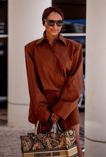 Главный хит летнего сезона — платье-рубашка — удачно вписался даже в каннскую фэшн-повестку, в очередной раз подтвердив свою универсальность. Актриса и модель Кэт Грэм подала отличную идею образа с любимым элементом гардероба, в котором можно выйти как на красную дорожку, так и на обычную прогулку по городу. Звезда примерила платье-рубашку мини в насыщенном шоколадном оттенке, которое смотрелось крайне выигрышно в оверсайз-исполнении. Кэт дополнила наряд открытыми босоножками на небольшом каблуке в тон, составив гармоничный монохромный лук. Выход завершили сумка-тоут Dior и темные солнцезащитные очки.