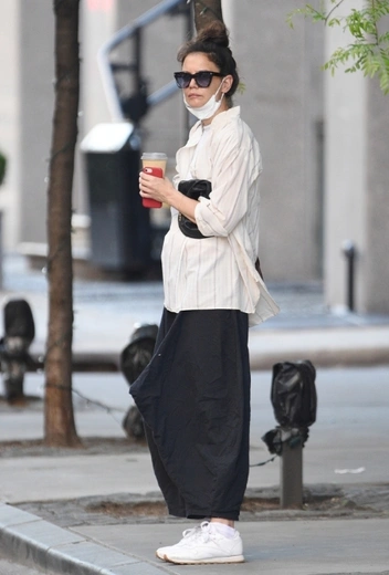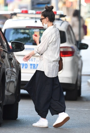 На днях стало известно, что сердце Кэти Холмс снова свободно: ее бурные отношения с известным ресторатором Эмилио Витоло оборвались так же резко, как и начались. Что послужило причиной расставания знаменитостей, до сих пор неизвестно, но эта новость явно расстроила фэшн-фотографов и модных обозревателей, которым очень полюбились колоритные совместные выходы Кэти и Эмилио. Впрочем, после разрыва актриса явно не намерена снижать градус собственного стиля и демонстрирует это в своем последнем выходе. Кэти эффектно сочетает светлую рубашку в полоску с черными шароварами и белыми кроссовками. Лук завершают солнцезащитные очки и сумка на одно плечо.