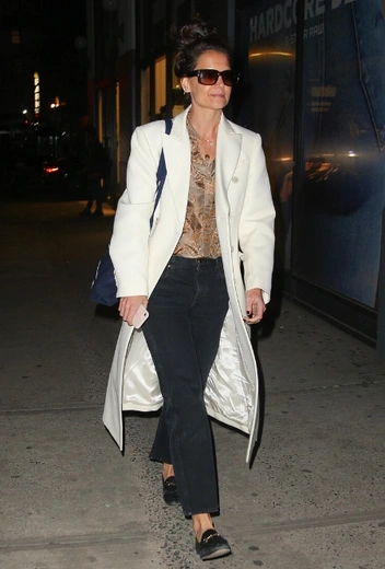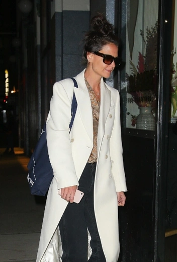 После трех месяцев без яркого солнца и приятного для глаза разнообразия колор-палитры вещи в светлых оттенках начинают казаться настоящей отдушиной: под конец холодного сезона встаем на сторону Кэти Холмс и начинаем активно искать себе пальто кремового оттенка и стильные солнцезащитные очки для модного делового образа в дневное время. Актриса и модель включает в свой фэшн-лук коричневую блузу с принтом, укороченные прямые джинсы и легкие туфли с пряжками.