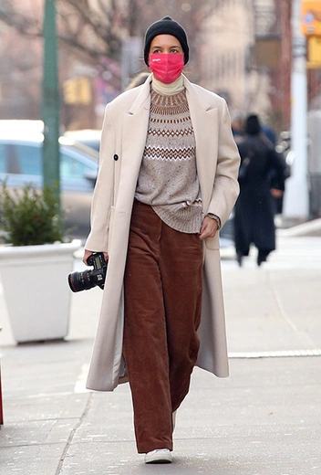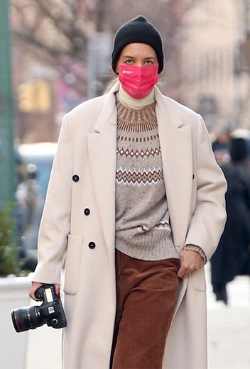 Каждый новый выход Кэти Холмс — полезный урок для собственного гардероба. Американская актриса с легкостью составляет идеальные повседневные аутфиты, в которых любая женщина будет чувствовать себя комфортно. После череды праздничных дней мы вновь заметили Кэти на улицах. В новом образе она показала, с чем теперь стоит сочетать скандинавские свитеры. Звезда взяла за основу вариант в бежевых тонах и дополнила образ коричневыми брюками, объемным молочным пальто и черной шапкой бини.