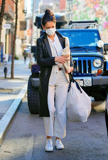 Сочетание черного и белого – довольно привычная комбинация. Правда, несмотря на свою универсальность, со временем даже такой классический ансамбль может наскучить. Решение есть: Кэти Холмс в повседневном образе решает делать ставку на небанальное сочетание фактур. Звезда взяла за основу кожаный тренч, который дополнила костюмом молочного цвета и кипенно-белой блузой с рюшами. Образ получился лаконичным, базовым и при этом более интересным, чем привычные ахроматические комбинации.