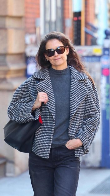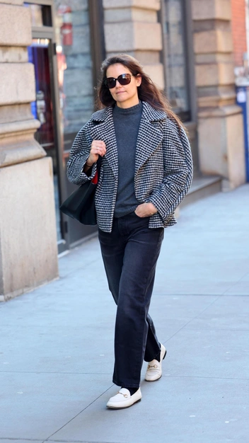 Кэти Холмс появилась на улицах Нью-Йорка в безупречном образе для ранней весны. Актрисе приглянулась драповая клетчатая куртка, которая любой базовый образ сделает интересным — рекомендуем к ней присмотреться. Под верхнюю одежду она надела свитер в графитовом оттенке и стильные черные джинсы с выбеленным эффектом. Завершили трендовый аутфит лоферы Gucci в молочном цвете, кожаная сумка с акцентной красной подкладкой, а также солнцезащитные очки.