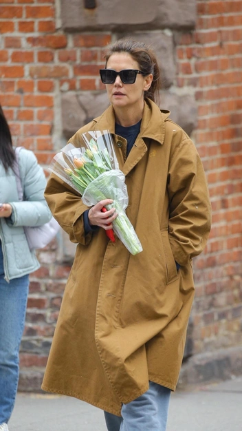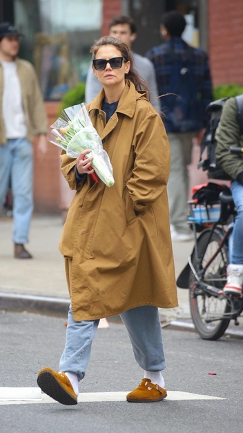 Кэти Холмс продолжает раздавать стиль на улицах Нью-Йорка в спортивных серых джоггерах. Образ в них мало у кого получится модным — здесь большую роль играет верхняя одежда и подобранная обувь. Так, для прогулки знаменитость выбрала безупречный плащ расклешенного кроя и замшевые сабо, надетые поверх белых носков. Яркой деталью в повседневном луке стали безупречные солнцезащитные очки и, конечно, цветы.