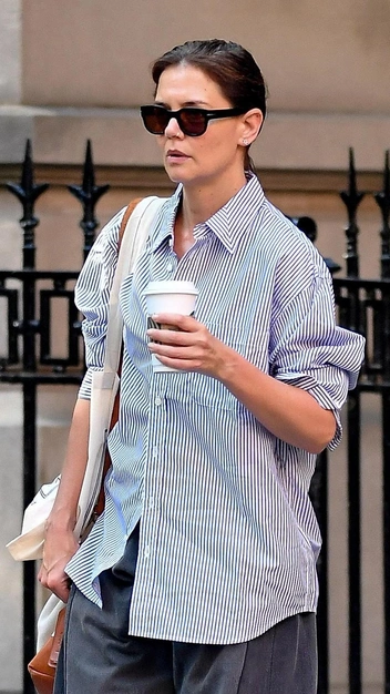 Чтобы выглядеть стильно, вам необязательно застегивать все пуговицы на рубашке — наоборот, у современных девушек это считается дурным тоном. Берите пример с Кэти Холмс: она надела рубашку в пижамном стиле и расстегнула у нее верхние и нижние пуговицы. Объем сбалансирован широкими джинсами, которые придали образу форму песочных часов. Завершили стильный выход кожаные балетки и очки в классической оправе.