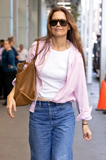Американская актриса Кэти Холмс составила потрясающий кэжуал-лук для прогулки с подругой. Звезда сочетала джинсы классического синего цвета и прямого кроя с нежно-розовой рубашкой, которая освежает внешность. Образ дополнили солнцезащитные очки с коричневой оправой, а также вместительная сумка-тоут. С таким аксессуаром можно отправиться на работу, за покупками или просто на прогулку.