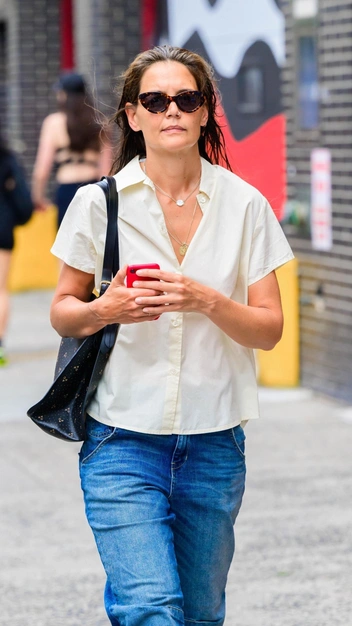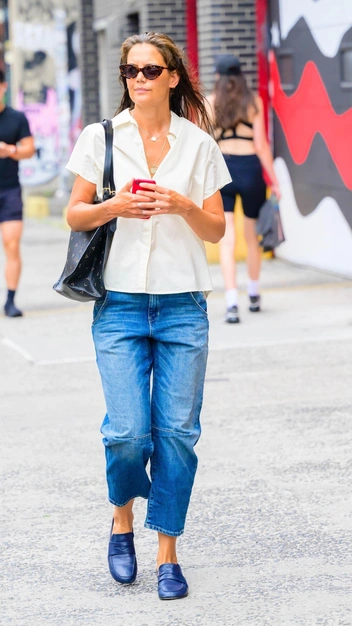 Знаменитости давно доказали, что нет ничего моднее сочетания джинсов и рубашки. Так, Кэти Холмс решила подтвердить истину и примерила на себя рубашку в молочном оттенке с короткими рукавами и широкие синие джинсы на средней посадке. К стильному выходу актриса подобрала кожаные лоферы с круглым мысом, лаконичную сумку-шопер и модные очки, которые придают простому образу элегантность.