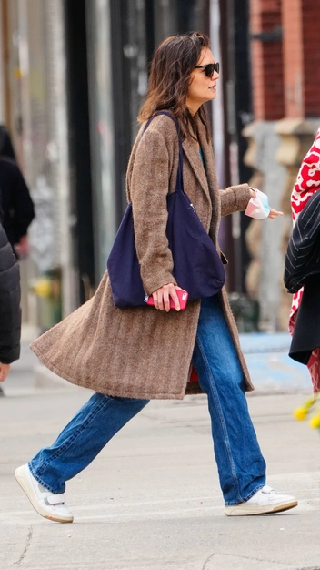 Кэти Холмс — королева расслабленных повседневных луков. Звезда легко собирает классные образы, для которых использует проверенные временем и любимые вещи. Например, это однобортное пальто, в котором Кэти появлялась на публике уже очень много раз. На этот раз селебрити решила подобрать к нему прямые синие джинсы, укороченный кардиган и белые кожаные кроссовки. Гармоничным завершением образа стали солнцезащитные очки и вместительный шоппер.