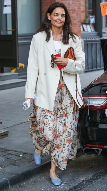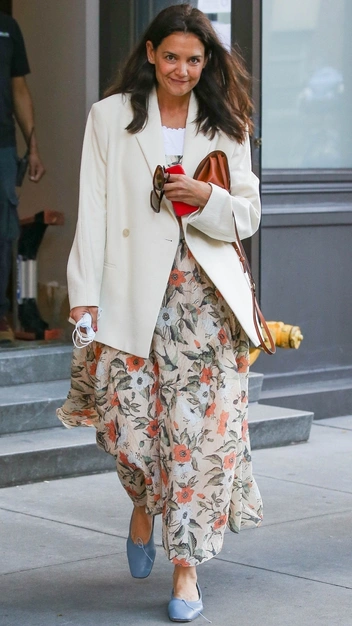 Кэти Холмс любит комбинировать в одном аутфите вещи разных стилей. Так, летящую юбку макси с цветочным принтом звезда сочетает с белой футболкой и двубортным жакетом. К стильному наряду Кэти добавила голубые балетки на плоском ходу и небольшую кожаную сумку.