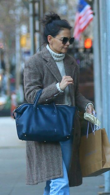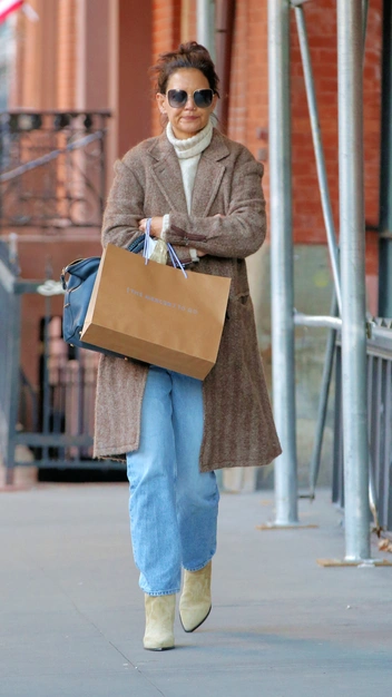 Гардероб Кэти Холмс — источник вдохновения для поклонников базового стиля. Актриса умело комбинирует трендовые и классические вещи. На днях звезду заметили в Нью-Йорке. Кэти вышла на прогулку в любимых голубых джинсах прямого кроя, свитере молочного оттенка с высоким воротом и пальто. Свой уютный образ Холмс дополнила замшевыми ботильонами, солнцезащитными очками и вместительной сумкой.