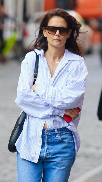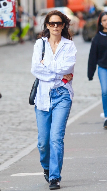 После сотрудничества Кэти Холмс со стилистом Эллисон Борнштейн внешний вид актрисы преобразился: теперь ее называют новой модной иконой и трендсеттером. Поспорить с этими убеждениями невозможно, ведь знаменитость доказывает их правду каждым своим выходом. Так, недавно она появилась на улицах Нью-Йорка в модном аутфите. Девушка примерила прямые джинсы на низкой посадке и хлопковую рубашку «с мужского плеча», которую она расстегнула и небрежно заправила. Дополнила Холмс выход кроссовками, кожаной сумкой на длинном ремешке и очками.