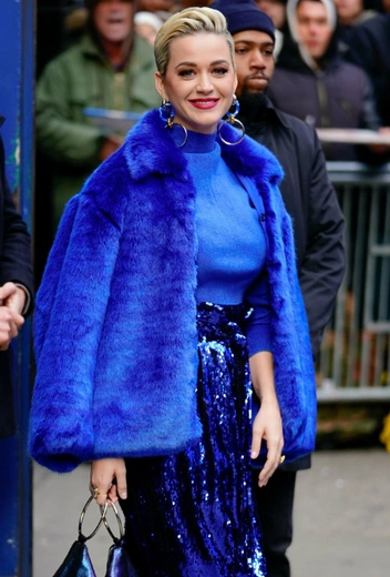 Кэти Перри — известная любительница сочных образов с максимальным градусом яркости. К слову, в ярко-голубой оттенок, который Кэти продемонстрировала в этом наряде, исполнительница даже красилась. Меховой полушубок, блестящие штаны-шаровары, уютная трикотажная кофта — провожать зиму можно и нужно ярко