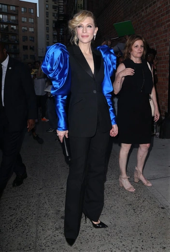 Осенне-зимняя коллекция Alexander McQueen последнее время пользуется особой популярностью среди звезд – во многом благодаря интересному решению с пышными бутонами роз. Такой декор особенно приглянулся и Кейт Бланшетт, известной любительнице драматизма в вечерних образах. Сейчас она активно промоутирует ленту «Куда ты пропала, Бернадетт?», в которой сыграла главную роль, и на днях актриса рассказывала о новой картине. При подготовке образа для шоу выбор пал на приталенный жакет с футуристичными синими рукавами в виде бутонов роз и классические черные брюки. Получился идеальный вечерний тандем!