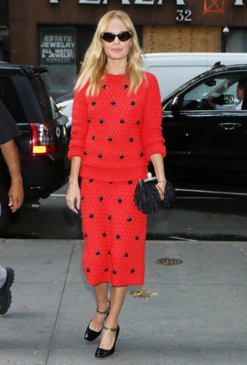 Осень — не повод отказываться от полюбившихся летом принтов и расцветок. Некоторые из них будут прекрасно смотреться и на более теплых, плотных тканях. Актриса Кейт Босуорт пробует черный горох в виде инкрустации и дополняет юбочный трикотажный комплект в красном элегантным клатчем с перьями (тренд осенне-зимнего сезона), класссическими туфлями на небольшом каблуке и черными очками. Отличный вариант для театрального выхода этой осенью.