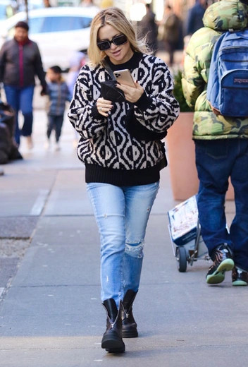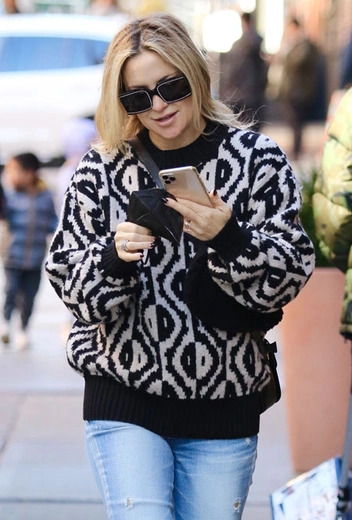 Без свитера не обходится ни один осенне-зимний гардероб. Пожалуй, именно вязаные изделия наряду с грубыми ботинками и пуховиком становятся нашей главной униформой в холода. Такая преданность нередко играет с нами злую шутку — вскоре нам становится скучно от однообразия, и хочется чего-то нового. У Кейт Хадсон уже есть альтернатива на замену лаконичным и базовым свитерам. Звезда выбрала необычный джемпер с психоделическим принтом в ахроматической палитре и дополнила образ скинни-джинсами и массивными ботинками.