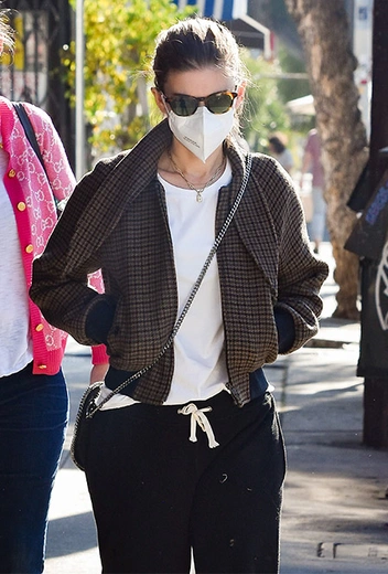 Кейт Мара – довольно непубличная персона, и перед папарацци появляется не так часто. Но все же редко, но метко радует поклонников появлениями в практичных и повседневных образах, которые стоит взять на заметку. Накануне она отправилась на прогулку и показала свой вариант casual-стиля. Девушка выбрала черные джоггеры, белую футболку и набросила поверх бомбер в мелкую клетку темно-коричневого оттенка.