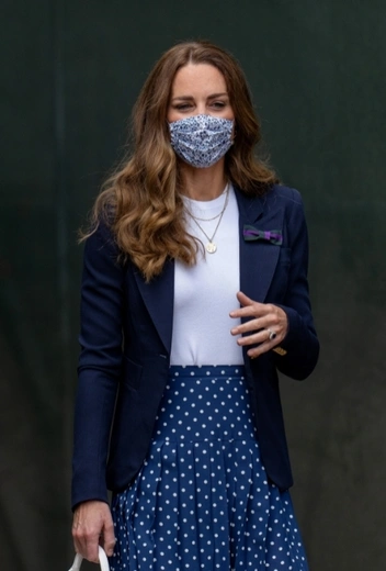 Кейт Миддлтон всегда становится самой ожидаемой гостьей Уимблдонского турнира и неизменно задает тон фэшн-повестке мероприятия. В этом году Ее Высочество решила сделать уклон в деловую элегантность и классику летнего стиля. Для своего появления на трибунах супруга принца Уильяма примерила юбку миди в принте polka dot в комбинации с базовым белым верхом. Кейт дополнила лук лаконичными туфлями-лодочками в белом цвете и темно-синим жакетом с бабочкой. Свой аутфит она завершила драгоценной подвеской и защитной маской.