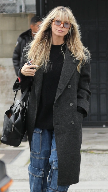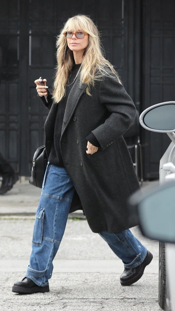 Супермодель отправилась на бьюти-процедуры в безупречном аутфите. Хайди Клум надела базовый черный свитшот и дополнила его ультрамодными широкими джинсами с накладными карманами. Завершила знаменитость выход массивными ботинками на платформе, строгим пальто цвета хаки, вместительной сумкой и очками в стиле нулевых.
