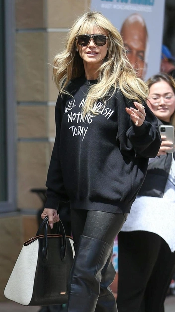 Хайди Клум вновь радует поклонников своим стильным выходом. Она примерила кожаные леггинсы и объемный черный свитшот с надписью. Акцент звезда сделала на обуви, надев ультрамодные высокие ботфорты на тонком каблуке. Не смогла она обойтись и без большой сумки — в нее уместится все, что нужно истинной моднице.