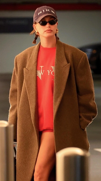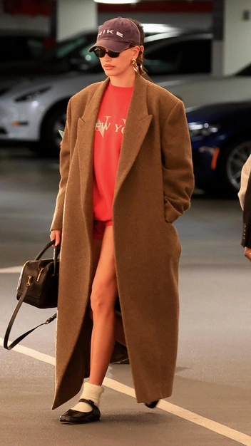 Хейли Бибер намекает: в жизни нам нужно лишь одно классическое пальто в длине макси, из которого не захочется вылезать. И это правда: прямая модель с акцентными плечами является классикой в женском гардеробе и позволяет надевать внутрь то, что хочется. Так, знаменитость примерила красный свитшот и микро-шорты, дополнив необычный аутфит туфлями Мэри Джейн на плоском ходу и белыми носками.