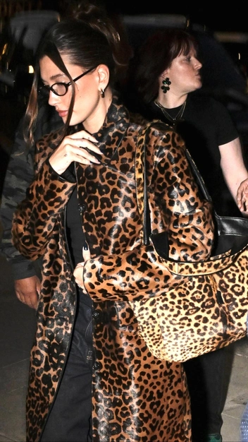 Вдохновляемся образом звезды и повторяем самый модный тренд этой осени, а именно — надеваем вещи с леопардовым узором. Хейли Бибер выбрала для эффектного выхода кожаный плащ длиной чуть ниже колена и подобрала к нему вместительную сумку в более светлом оттенке. Под низ она надела черную водолазку и базовые широкие джинсы. Завершили лук акцентные красные кроссовки, очки и украшения.
