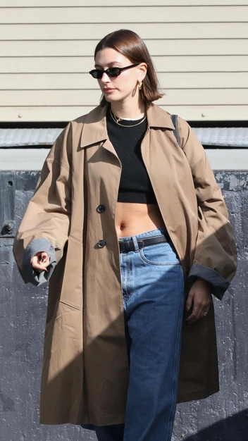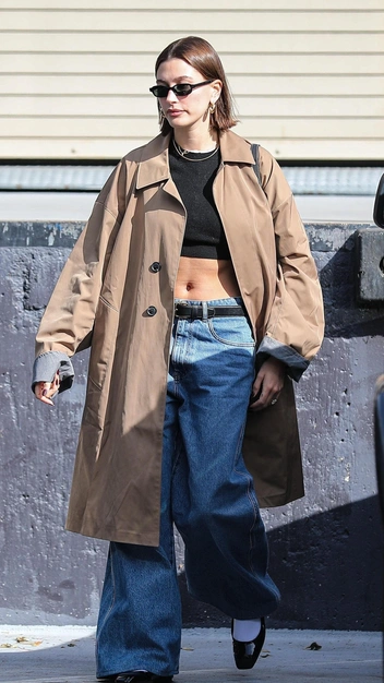 Завидуем Хейли Бибер: пока мы кутаемся в шарфы и шубы, знаменитость отправляется на прогулку в укороченном черном топе, расклешенных джинсах на средней посадке и эффектном тренче в бежевом цвете. С какой обувью носить такой образ? Можно подумать о кроссовках, но нам нравится вариант модели — она завершила выход лакированными балетками с квадратным мысом, надетыми поверх белых носков.