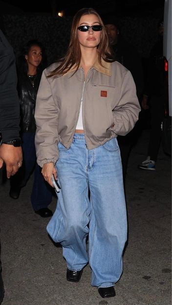 На фоне слухов о разводе Биберов модель стала реже появляться в публичных местах, но если папарацци и удается поймать Хейли, то она всегда выглядит модно. Взгляните на этот расслабленный трендовый образ. Знаменитость надела укороченный белый топ в сочетании с уже базовыми для нее джинсами-бэгги на средней посадке. Их она стилизует с лоферами с квадратным мысом и дополняет аутфит кроп-бомбером и узкими очками.
