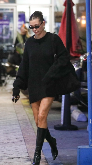 Сапоги до колена продолжают влюблять в себя женщин по всему миру: сегодня они выглядят трендово и эффектно, поэтому каждая выбирает для себя стильную модель. У Хейли Бибер тоже есть желанная коллекция обуви, которую она ловко демонстрирует. Например, на ужин с подругами она отправилась в элегантном платье-свитере в длине мини, узких сапогах с острым мысом и завершила выход аксессуарами: очками и объемной сумкой.