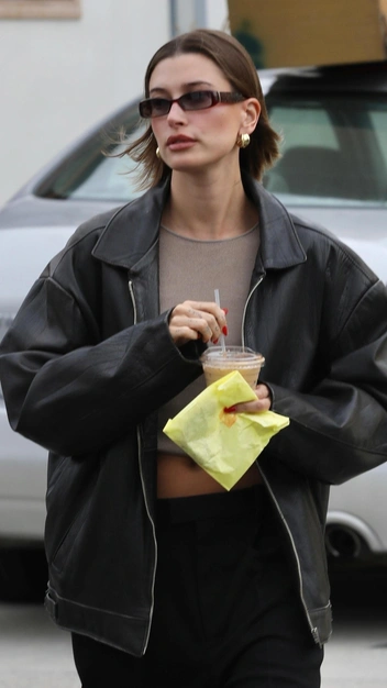 Икона стиля Хейли Бибер вновь показала модный аутфит, в котором она отправилась на прогулку. Селебрити надела бежевый трикотажный топ, который подвернула, чтобы оголить живот, и широкие брюки со стрелками на низкой посадке. Дополнила Хейли выход идеальной кожаной курткой в винтажном стиле, ботинками, узкими очками и массивными серьгами-кольцами.
