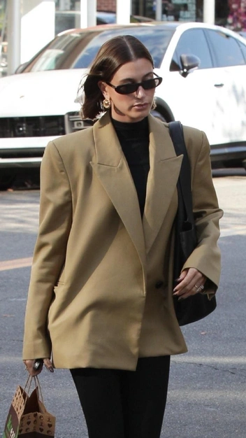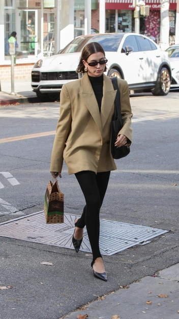 Хейли Бибер учит современных девушек нарушать модные правила и выглядеть стильно в любой ситуации. Например, на бизнес-встречу знаменитость отправилась в трендовом образе, который мы предлагаем повторить и вам. Она надела черный бадлон и подобрала к нему актуальные леггинсы со штрипками, дополнив аутфит объемным пиджаком с акцентными плечами. Лаконичный выход модель завершила аксессуарами: мюлями на низком каблуке, объемной сумкой-шопером, узкими очками и серьгами.