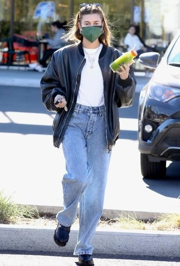В будущем сезоне стильной альтернативой пальто и тренчам традиционно станет кожаная куртка, количество возможных сочетаний с которой, пожалуй, просто не поддается счету. Более того, с ней даже самый базовый лук заиграет новыми красками и обретет особенный колорит. Как, например, это наглядно продемонстрировала своим последним выходом Хейли Бибер: звезда примерила классическое casual-сочетание со светлыми джинсами и белой футболкой, которое ярко оттенили черная кожаная куртка и грубые ботинки в тон. Лук завершили солнцезащитные очки и защитная маска.