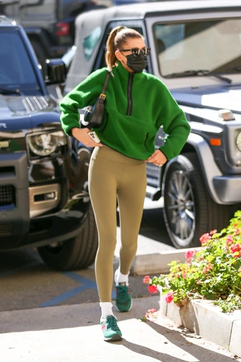 Хейли Бибер и ее подруга Кендалл Дженнер — одни из главных любительниц пилатеса в Лос-Анджелесе. Девушки регулярно посещают занятия и предпочитают ходить в спортзал вместе — так тренировки точно будут проходить веселее. Заодно знаменитости подкидывают несколько модных идей своим поклонницам, как даже в спортивных вещах выглядеть стильно и актуально. Хейли решила взять за основу нюдовый сет из топа на одно плечо и леггинсов и дополнить его объемным изумрудным джемпером из флиса с молнией.