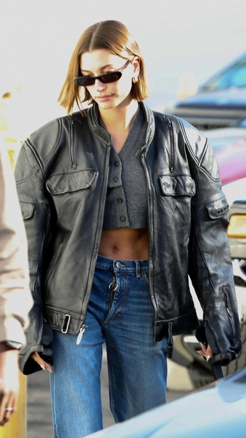 За самые трендовые образы отвечает Хейли Бибер. Ей легко удается сочетать в гардеробе женственные мини-платья и мужские байкерские куртки, и в обоих случаях она выглядит эффектно и сексуально. Предлагаем вдохновиться недавним выходом модели и повторить его как можно скорее. Хейли надела укороченный серый кардиган и выбеленные джинсы-бэгги на средней посадке. Дополнила она аутфит массивной кожаной курткой, сумкой в спортивном стиле и мокасинами с квадратным мысом.