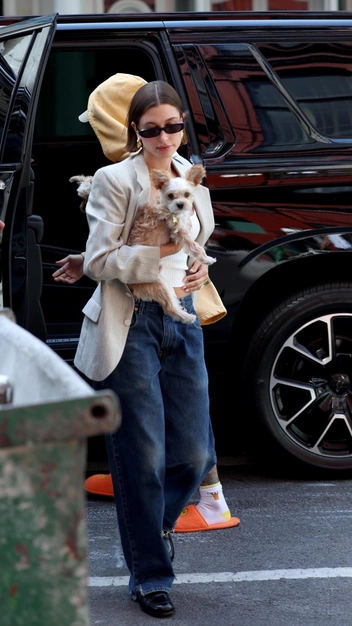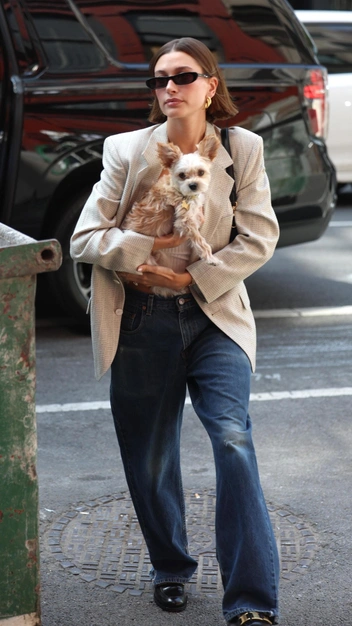 Даже на встречи в домашней обстановки Хейли Бибер подбирает стильные аутфиты, в которых сочетает классику и последние тренды. Так, топ-модель примерила белый укороченный топ в рубчик и уже полюбившиеся ей джинсы-бэгги с выбеленным эффектом. Дополнила актуальный образ она объемным винтажным пиджаком, кожаными лоферами с пряжкой, лаконичной сумкой и модными узкими солнцезащитными очками.