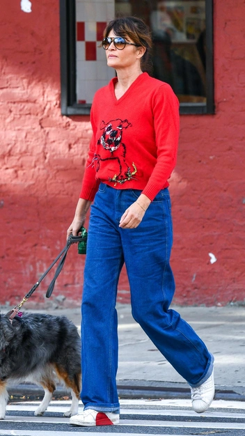 Красный цвет — один из самых трендовых этой осенью и зимой. Если вы хотите повторить модную тенденцию, тогда присмотритесь к недавнему выходу Хелен Кристенсен в Нью-Йорке. Звезда вышла на прогулку с собакой в укороченном красном свитере с V-образным вырезом и принтом в виде пса. К нему она подобрала вновь популярные кроссовки adidas Superstar, которые гармонично перекликаются с трикотажем, и дополнила аутфит свободными синими джинсами — с ними оттенки красного всегда выглядят безупречно.
