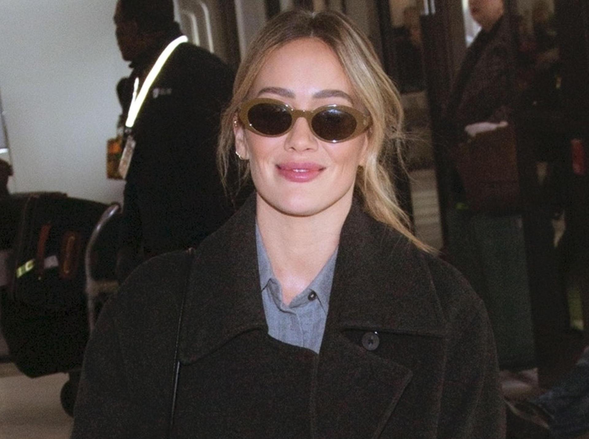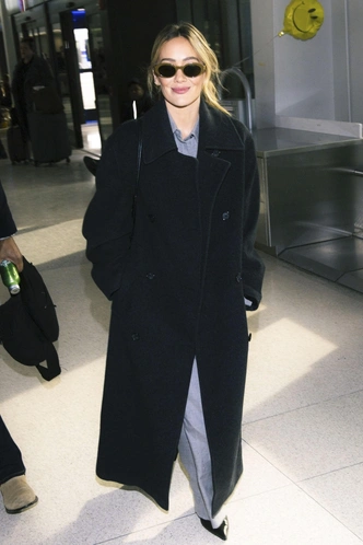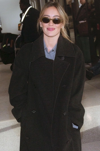 Хилари появляется в аэропорту как героиня старых папарацци‑снимков: прямые серые брюки и объемное черное пальто, застегнутое до подбородка, напоминают те самые андрогинные образы Кейт Мосс и Гвинет Пэлтроу в конце 90‑х. Минимум макияжа, небрежно собранные волосы и остроносые туфли, выглядывающие из‑под широких штанин, делают лук предельно спокойным, но именно эта будничная неидеальность и возвращает ощущение настоящего grunge‑chic, которым когда‑то жили все журнальные съемки того десятилетия.