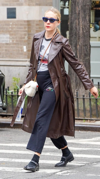 Да, Хлоя Севиньи сделала это за нас: актриса вышла на улицу в пижаме, не скрывая ее под объемными кофтами и куртками. Она надела костюм из серого топа с Микки Маусом и укороченных темно-синих брюк, поверх которого накинула трендовый кожаный плащ. Дополнила звезда выход лакированными туфлями с раздельным большим пальцем с носками, меховой сумкой и узкими очками.