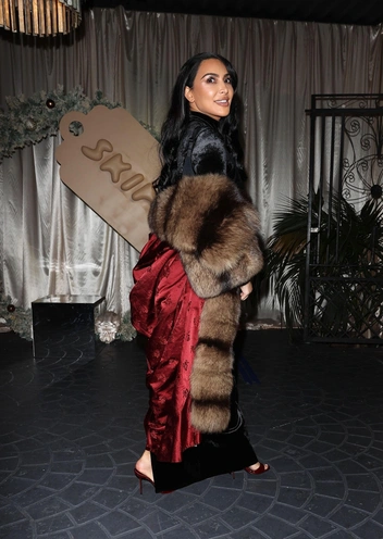 Ким Кардашьян встречает праздники вместе так, как умеет только она: черное бархатное платье с корсетным верхом подчеркивает талию и бедра, а поверх небрежно наброшена объемная меховая накидка шоколадного оттенка, которая делает силуэт почти королевским. Красная шелковая юбка с драпировкой и лакированный цилиндр‑клатч в тон добавляют в этот total glam нотку восточного театра и немного рождественской драмы, превращая новогоднюю вечеринку в полноценный модный перформанс — лучший варинт для главной ночи года.