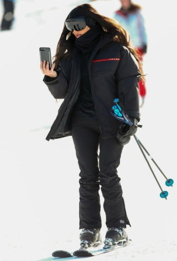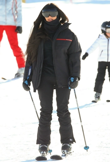Работа блогера совсем не легка: даже отправившись на горнолыжный курорт, Ким не расстается со своим смартфоном и смело скатывается со снежных склонов с включенной селфи-камерой. В этот раз звезда Instagram (запрещенная в России экстремистская организация) решилась на классический черный костюм, а розовый неон отложила до другого дня.