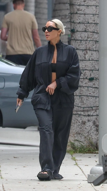 В этом сезоне самые модные девушки делают акцент на солнцезащитных очках, которые перестали быть лишь средством защиты. Сегодня они становятся главной деталью в образе, способной изменить самую скучную одежду. Убедитесь в этом сами на примере Ким Кардашьян. Звезда выбрала для прогулки черный спортивный костюм, который состоит из куртки и длинных брюк. К ним она подобрала ультрамодные крупные очки с широкими дужками — вам нужны такие же.
