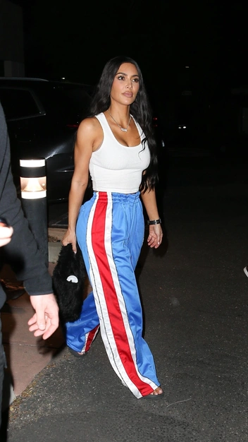 Если вы боитесь выходить в спортивном аутфите на мероприятия, предлагаем вдохновиться Ким Кардашьян и повторить ее образ. Селебрити вновь прибыла на игру своей дочери Норт, для которой она выбрала облегающий белый топ и атласные голубые брюки с акцентными красно-белыми лампасами. Каблуки на этот раз звезда сменила на сланцы и дополнила выход меховой сумкой и украшениями.