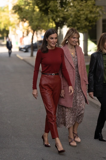 Королева Летиция — наша икона стиля. Она всегда выглядит безупречно, поэтому каждый ее выход нам с нетерпением хочется повторить и самим, этот раз — не исключение. Правительница появилась в бордовом тотал-луке, надев водолазку и кожаные брюки на высокой талии. Подчеркнула выход королева узким ремнем, остроносыми лодочками и серьгами, сияние которых видно издалека.