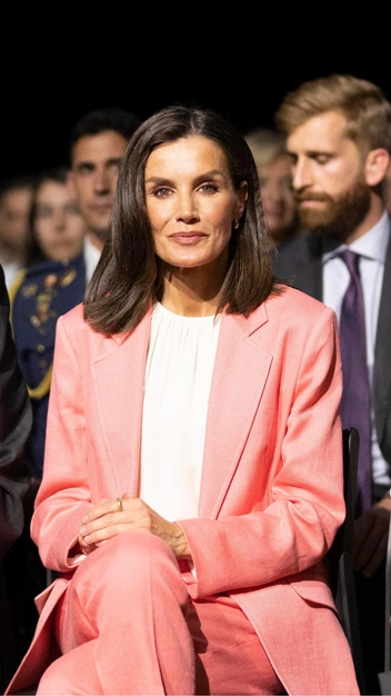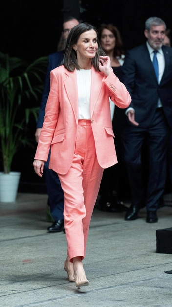 Стиль монаршей особы считается эталонным, и это неудивительно — ей всегда приходится выглядеть стильно, элегантно и официально. Вдохновляться стоит не только вечерними образами Летиции, но и деловыми, которые можно смело повторять на работу. Например, на весну и лето пополните гардероб легким брючным костюмом в пастельных тонах — королева Испании выбрала персиково-розовый. К нему она подобрала белую блузу, бежевые лодочки и едва заметные украшения.