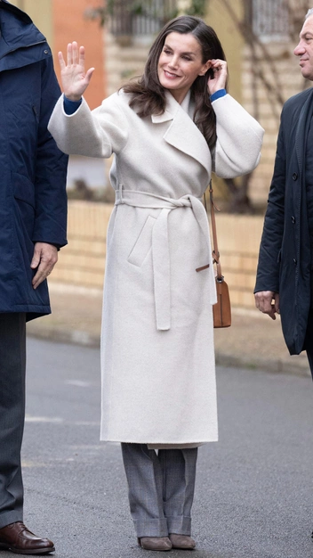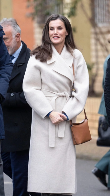 Королева Летиция не боится носить яркие и акцентные вещи, но в любом своем образе монаршая особа следует минимализму. Чем меньше деталей — тем меньше шансов совершить модную ошибку. Так, королева Испании для недавнего выхода выбрала классический синий джемпер и серые брюки в клетку, дополнив аутфит лаконичным пальто-халатом в молочном оттенке. В качестве аксессуаров она выбрала аккуратную кожаную сумку в коричневом цвете и замшевые зеленые сапоги.