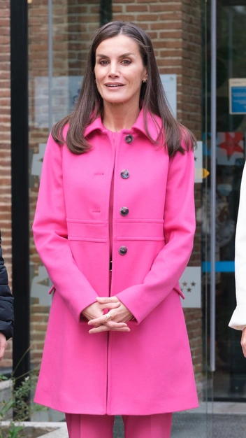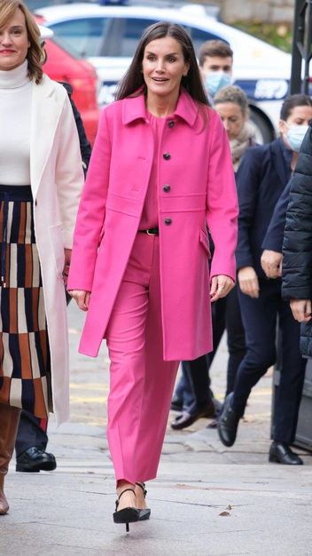Королева Летиция появилась в безупречном образе в ярко-розовом оттенке, который был признан цветом 2022 года. Монаршая особа для официального визита выбрала утонченный и женственный аутфит. Она надела укороченные брюки со стрелками и блузу с круглым вырезом. Дополнением выхода стали приталенное пальто с отложным воротником, черные остроносые босоножки и узкий ремень на талии.