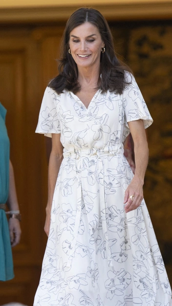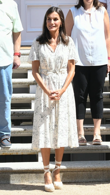 Платья-рубашки — один из любимых предметов гардероба сред монарших особ. Королева Летиция примерила модель молочного оттенка с коротким рукавом и лаконичным рисунком. К наряду селебрити подобрала эспадрильи на платформе и шнуровке.
