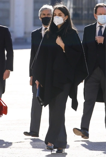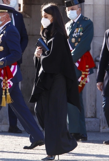 Первый официальный выход Ее Величества после Нового года привлек к себе все внимание папарацци в испанской столице — настолько эффектным и одновременно утонченным он получился. Для ежегодной военной церемонии Ее Величество подобрала брючный образ в total-black, который составили брюки палаццо, кейп и классические туфли-лодочки. Аутфит дополнили черный клатч, минималистичные украшения и защитная маска.