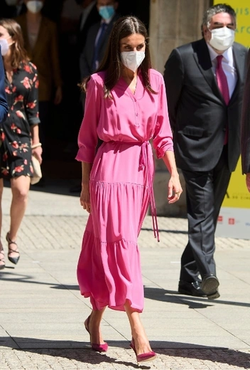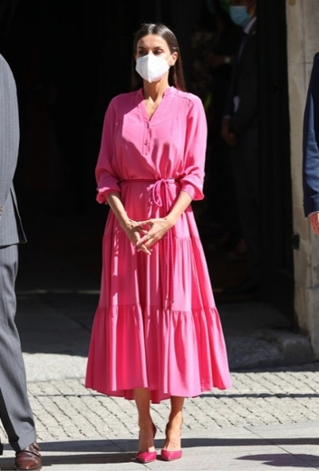 Истинная ценительница всех оттенков цвета испанской страсти, королева Летиция знает толк и в других ярких колор-вариантах. Одним из фаворитов Ее Величества неизменно является розовый цвет: для официальных выходов она часто выбирает образ в его тонах, а иногда даже решается на смелый монохромный лук в total-pink. На днях Ее Величество посетила открытие выставки в Мадриде, для которого подобрала именно такой образ. Супруга Филиппа VI выгуляла легкое летящее платье с тонким поясом в нежно-розовом оттенке, которое дополнили туфли-лодочки в тон наряда. В этот раз Ее Величество решила обойтись без драгоценных украшений, акцентировав внимание на самом аутфите.