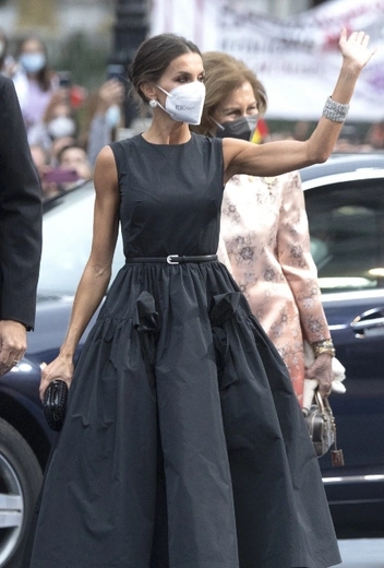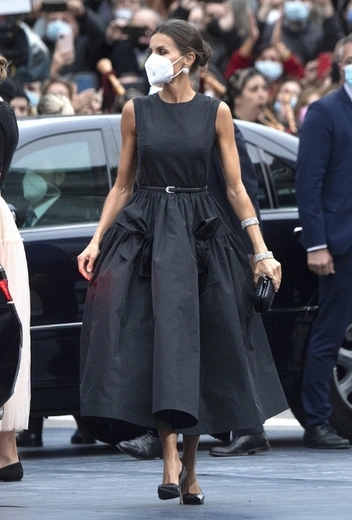 Королевская семья Испании всем составом приехала в Овьедо, чтобы принять участие в церемонии награждения Премии принцессы Астурийской, посвященной достижениям в социальной, гуманитарной и естественнонаучной сферах. В этом году все внимание традиционно было приковано к Ее Величеству, которая сделала ставку на классику total-black и точно не проиграла в этом. Супруга Филиппа VI появилась на публике в пышном черном платье с поясом от бренда The 2nd Skin Co., которое дополнили туфли-лодочка в тон от Manolo Blahnik и клатч Bottega Veneta.