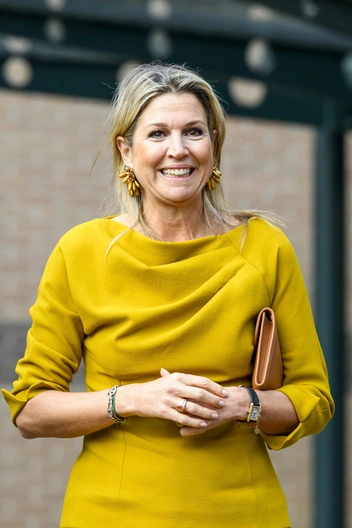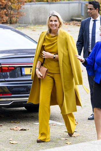 Королеву Нидерландов Максиму трудно представить в светлой или темной гамме. Обычно монарх предпочитает яркую одежду, которую дополняет крупными украшениями с драгоценными камнями. На этот раз Максима отправилась на форум по вопросам здоровья в ярком лимонно-оливковом оттенке. Монарх подобрала верх с воротником-халтер, прямые брюки и пальто того же цвета. Образ дополнили массивные серьги из золота, а также обувь коричневого оттенка.