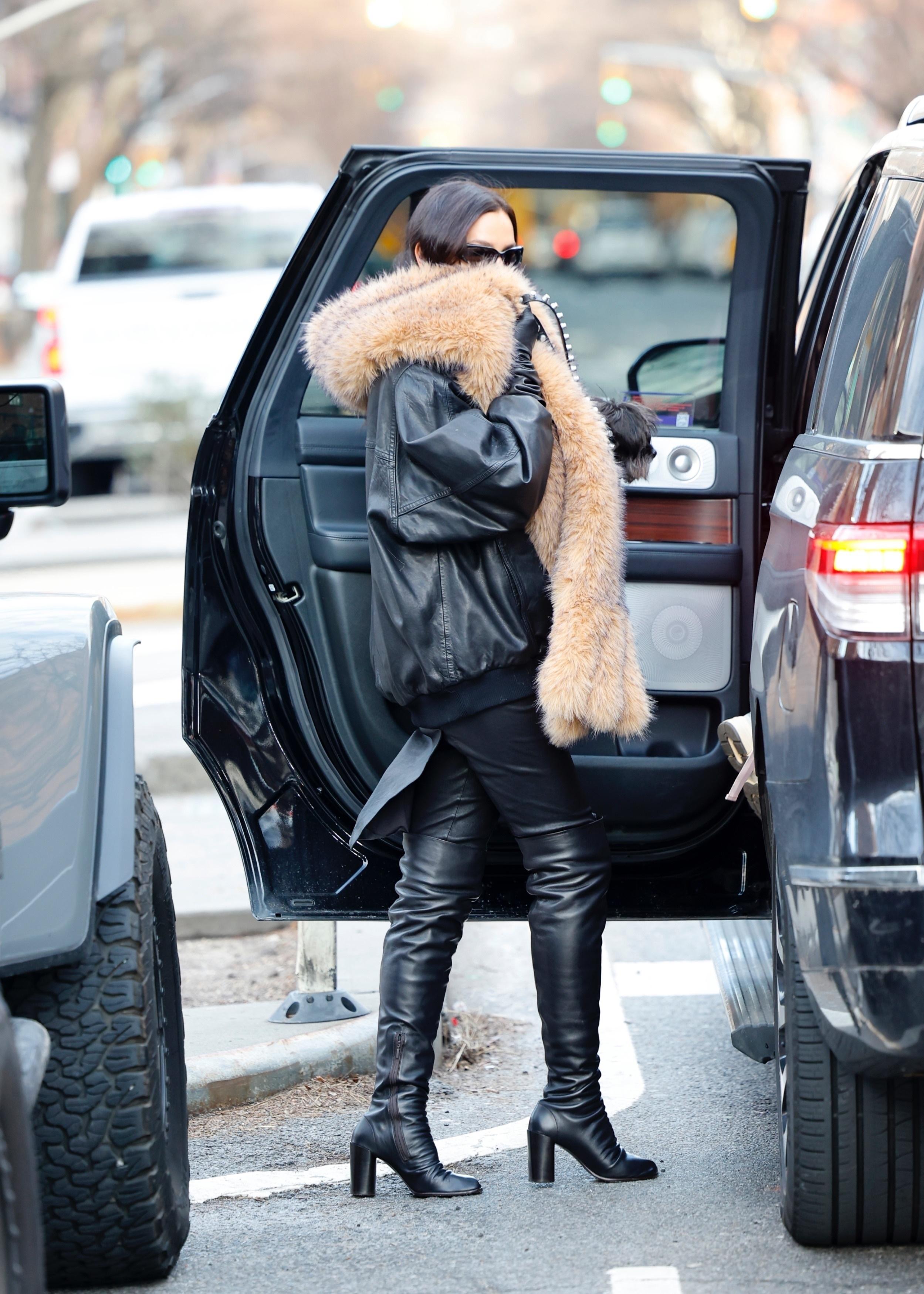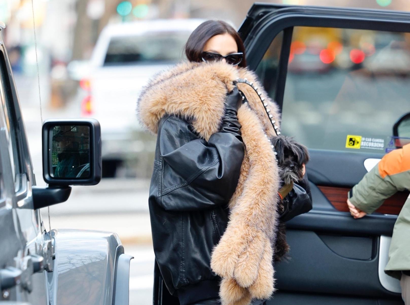 Ирина снова доказывает, что лучше всех понимает язык драматичных зимних фактур: к своему фирменному total black она добавляет роскошный меховой шарф теплого рыжего оттенка, который буквально «обнимает» плечи модели и превращает выход из машины в кадр из фильма про мафиозную диву. Контраст гладкой кожи и пушистого меха делает силуэт максимально эффектным, но при этом функциональным — это тот случай, когда образ работает и как реальный зимний аутфит, и как вдохновение для всех, кто ищет способ носить мех не в формате классической шубы, а как главный акцент.